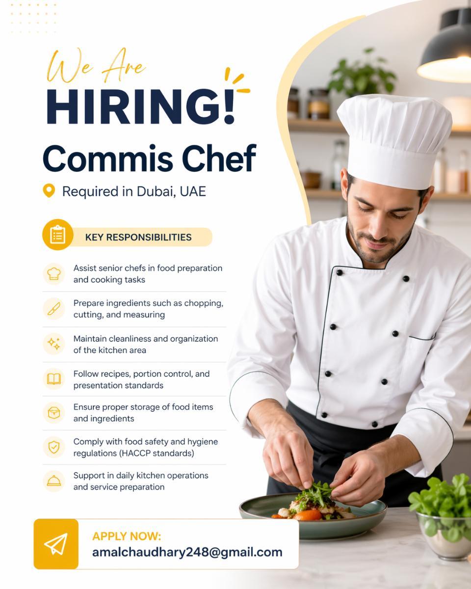 We are seeking a passionate, hardworking, and dedicated Commis Chef to support kitchen operations and assist in the preparation of high-quality dishes. The ideal candidate should be eager to learn, work well under pressure, and maintain strong hygiene and food safety standards.