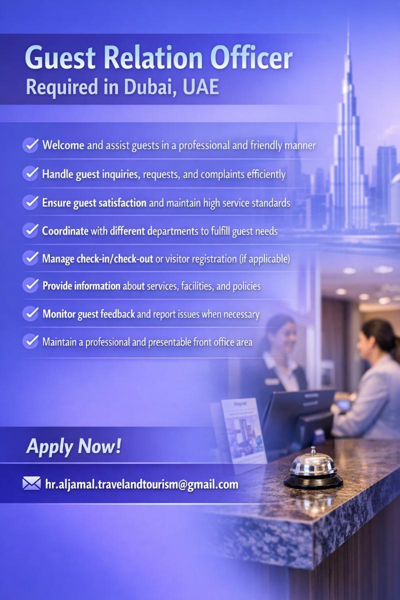 We are hiring a Guest Relations Officer who will be responsible for welcoming guests, ensuring a positive experience, and providing excellent customer service throughout their stay or visit.