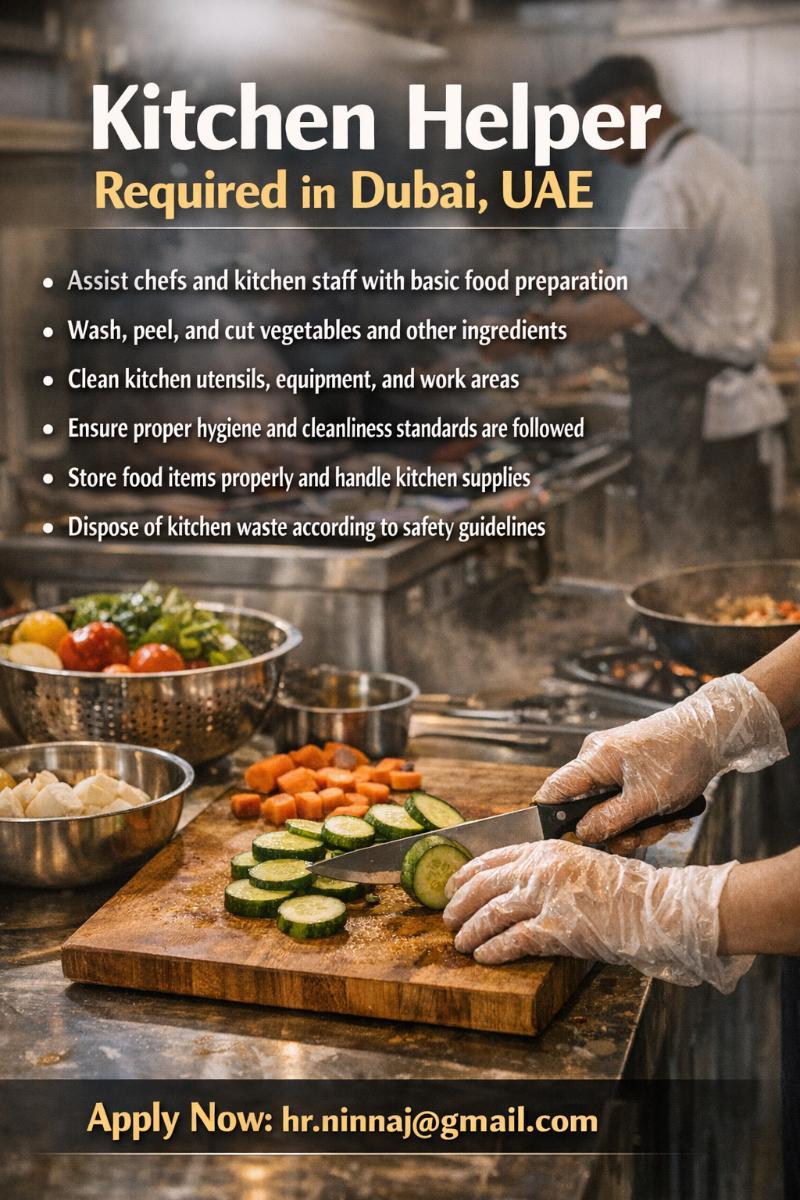 We are seeking a Kitchen Helper to join our hospitality team. You will be responsible for assisting the kitchen staff with food preparation, cleanliness, and maintaining hygiene standards. To be successful in this role, you should be hardworking, organized, and efficient in a fast-paced kitchen environment.
