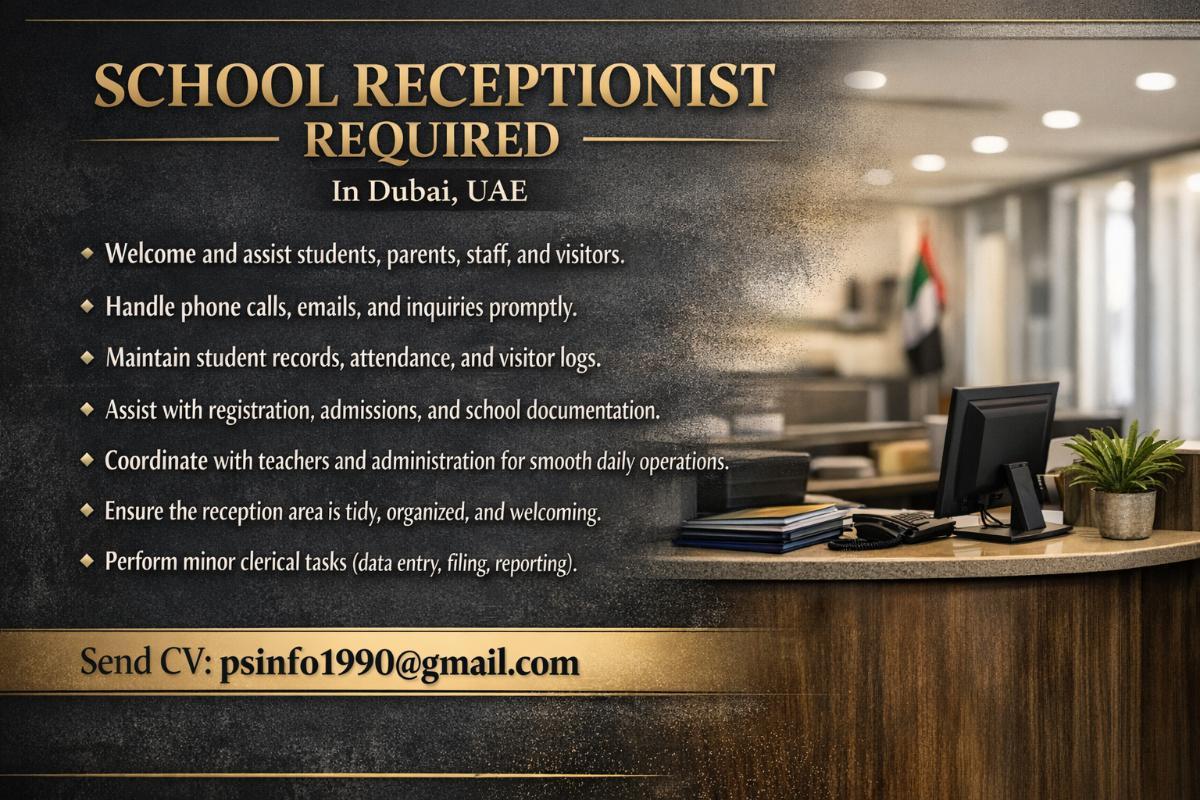 A reputed school in Dubai is looking for a professional and friendly School Receptionist for immediate joining.
