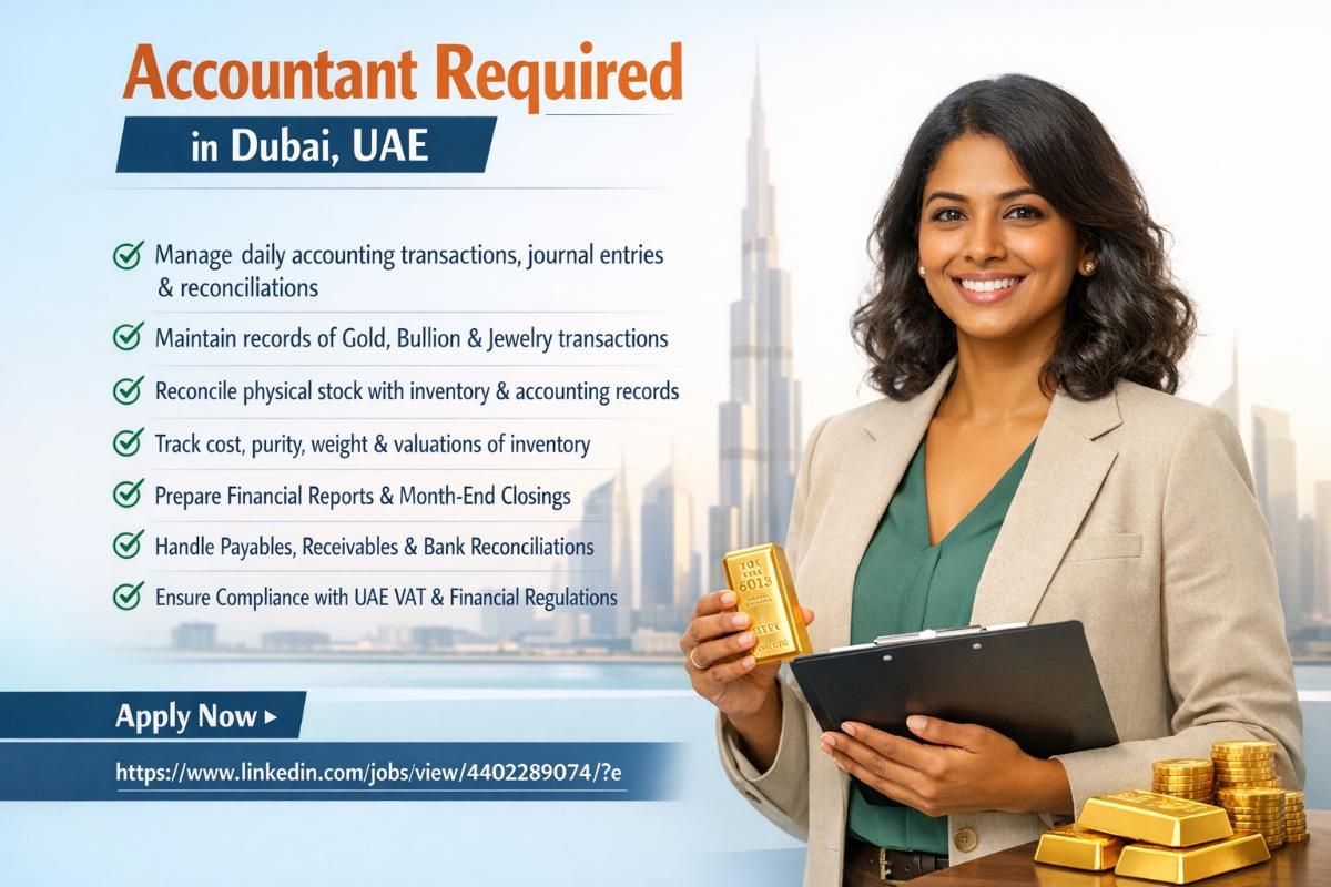 Jewelust is seeking a full-time, on-site Accountant based in Dubai to support the financial operations of our jewelry, gold, and bullion trading business. The Accountant will be responsible for managing day-to-day accounting activities, maintaining accurate financial records, reconciling accounts and stock-related transactions, and ensuring compliance with applicable financial and tax regulations in the UAE.
