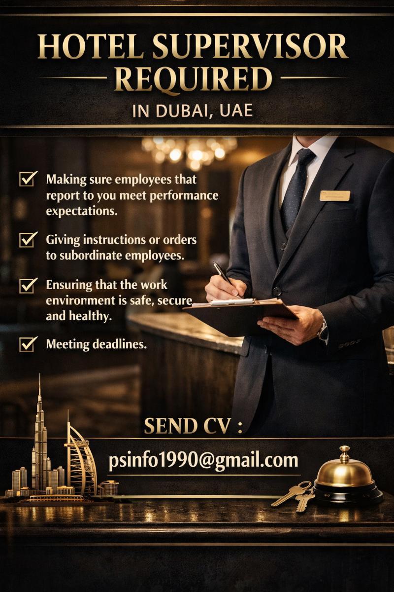 Hotel Supervisor Required in Dubai