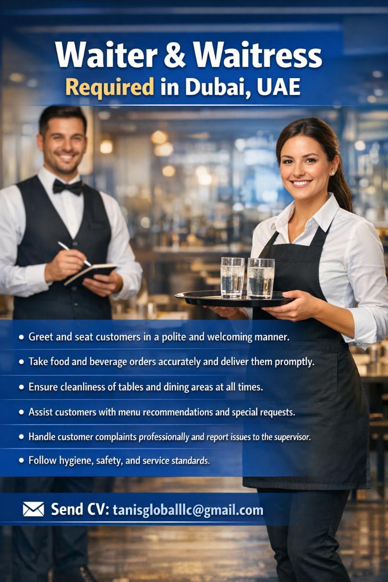 We are looking for a friendly and professional Waiter / Waitress to join our hospitality team. The ideal candidate will provide excellent customer service, take accurate orders, serve food and beverages efficiently, and ensure a pleasant dining experience for all guests.